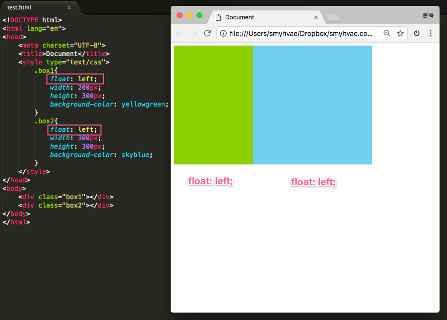 此时,如果给这两个div增加一个浮动属性,比如float: left;,效果如下: